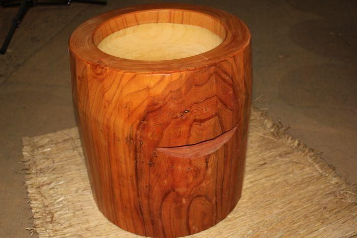 ※天然丸太材を使用するため、どのような臼でも多少のキズ、シミ、僅かな小ヒビはございます。また穴の中は芯割れを防ぎ、補強、水漏れ防止ために大小数個の埋め木(写真参照)をしてあります。見かけは悪く感じられる方もいるかも知れませんが埋め木はとても大切で水漏れ防止や耐久性のためにはなくてはならないものです。