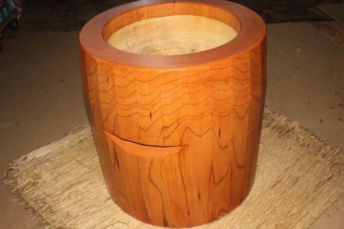 〇外側は割れ止め剤及びウレタン塗装、内側は芯割れを防ぎ、補強、水漏れ防止ために大小数個の埋め木をしてあります。埋め木について良くお問い合わせがありますが、埋め木はとても大切で水漏れ防止や耐久性のためにはなくてはならないものです。