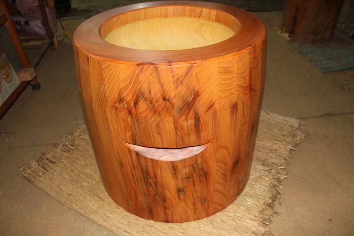 ※天然丸太材を使用するため、どのような臼でも多少のキズ、シミ、僅かな小ヒビはございます。また穴の中は芯割れを防ぎ、補強、水漏れ防止ために大小数個の埋め木(写真参照)をしてあります。見かけは悪く感じられる方もいるかも知れませんが埋め木はとても大切で水漏れ防止や耐久性のためにはなくてはならないものです。